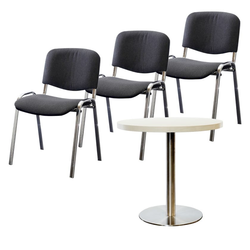 Rund, Platte weiß oder buche, H: 72 cm, Ø 60-80 cm, mit 3 Stühlen (anthrazit).